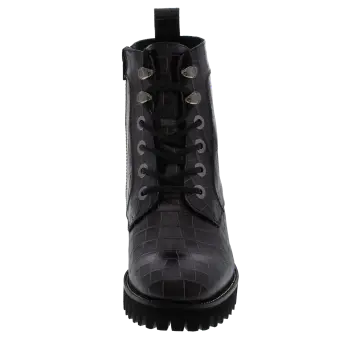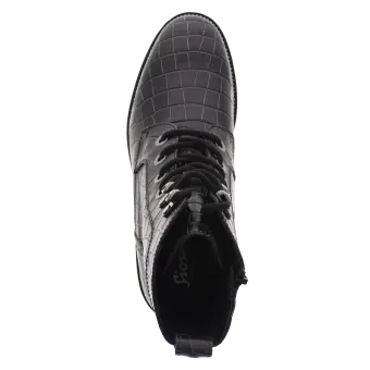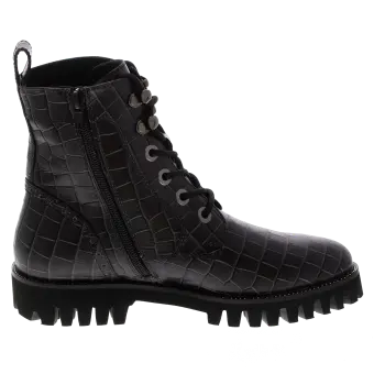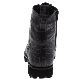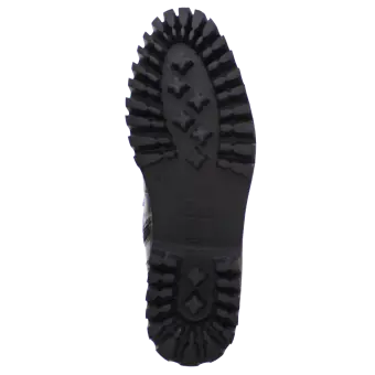 Modischer Biker-Boot für Frauen aus modisch geprägtem Rindleder. Die Kombination aus Lochungen an der Fersenkappe, auffälligen Ösen und einem feinen Silberrahmen macht diesen Schuh zum absoluten Eye-Catcher. Durch den seitlichen Reißverschluss ist ein problemloser Einstieg garantiert und das geringe Gewicht des Schuhes mit seiner markant profilierten Sohle sorgen für Freude am Tragen. Eine herausnehmbare Ledereinlage und ein Mikrofaser-Textilfutter runden dieses Modell ab.