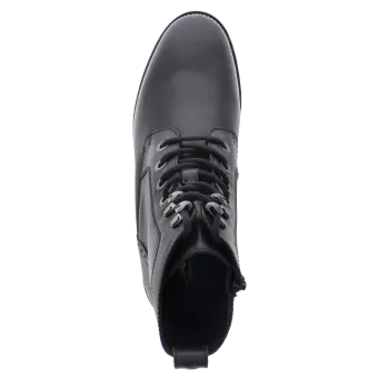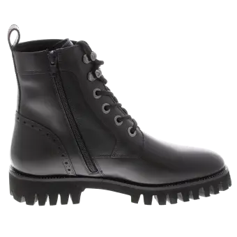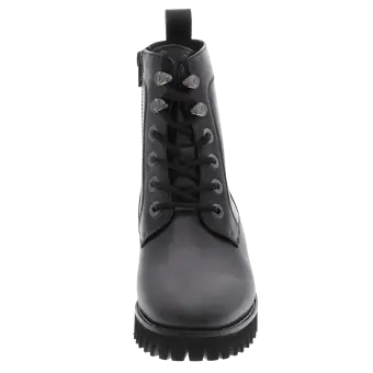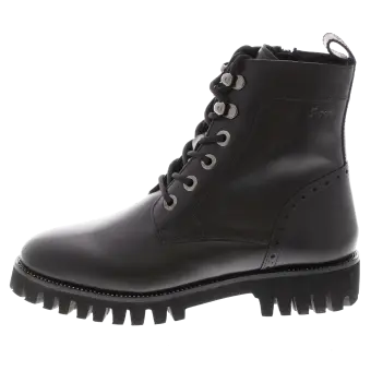 Modischer Biker-Boot für Frauen aus handschuhweichem Kalbleder. Die Kombination aus Lochungen an der Fersenkappe, auffälligen Ösen und einem feinen Silberrahmen macht diesen Schuh zum absoluten Eye-Catcher. Durch den seitlichen Reißverschluss ist ein problemloser Einstieg garantiert und das geringe Gewicht des Schuhes mit seiner markant profilierten Sohle sorgen für Freude am Tragen. Eine herausnehmbare Ledereinlage und ein Mikrofaser-Textilfutter runden dieses Modell ab.