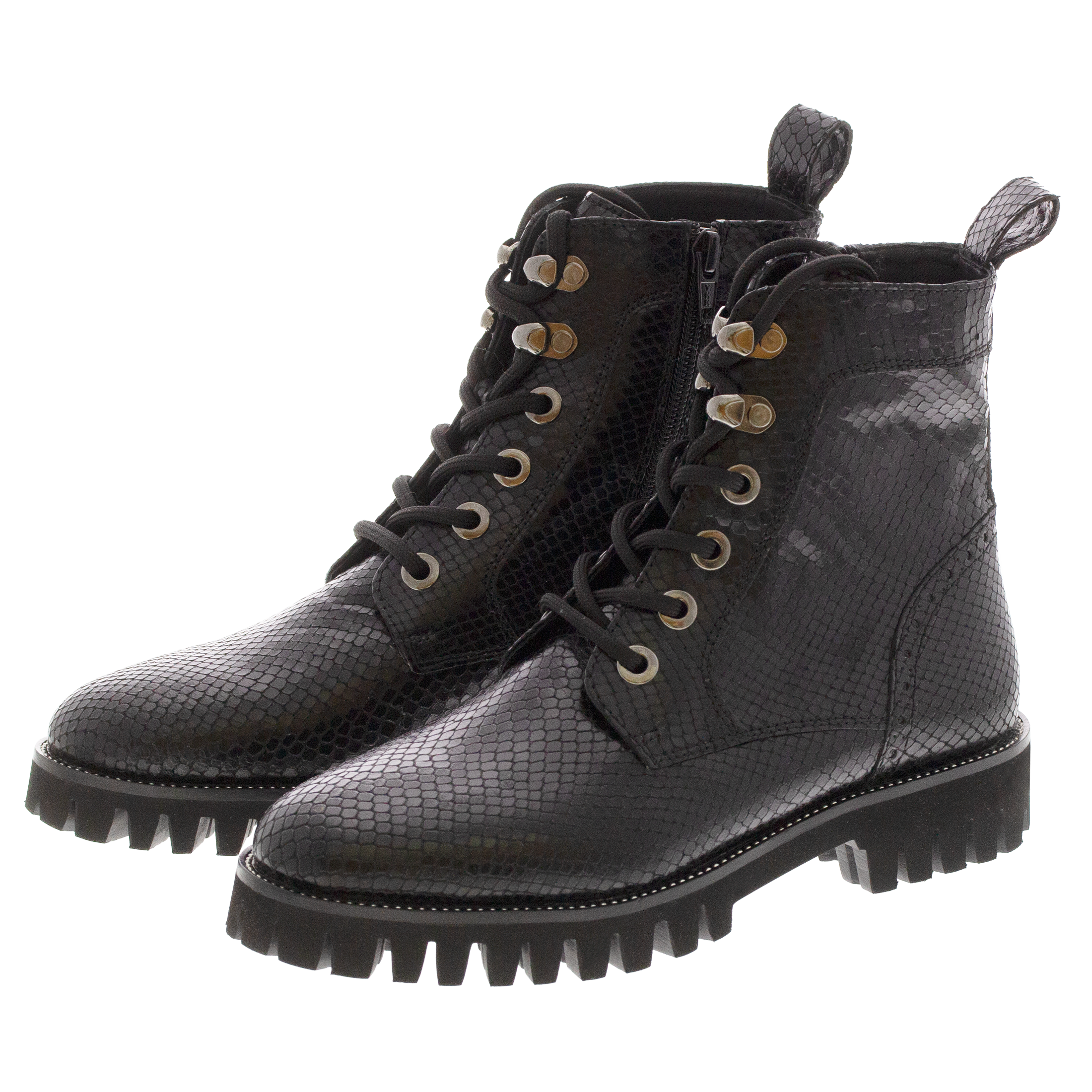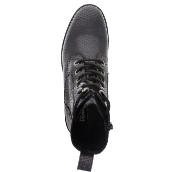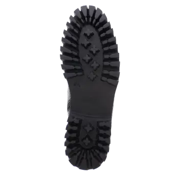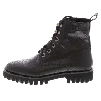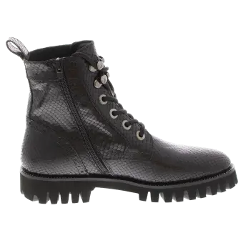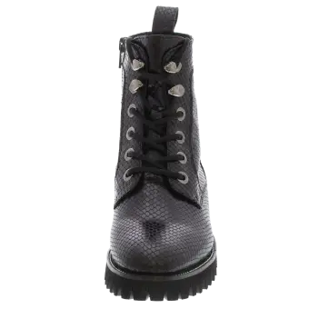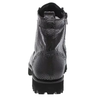 Modischer Biker-Boot für Frauen aus Kalbleder mit Schlangenleder-Optik. Die Kombination aus Lochungen an der Fersenkappe, auffälligen Ösen und einem feinen Silberrahmen macht diesen Schuh zum absoluten Eye-Catcher. Durch den seitlichen Reißverschluss ist ein problemloser Einstieg garantiert und das geringe Gewicht des Schuhes mit seiner markant profilierten Sohle sorgen für Freude am Tragen. Eine herausnehmbare Ledereinlage und ein Mikrofaser-Textilfutter runden dieses Modell ab.