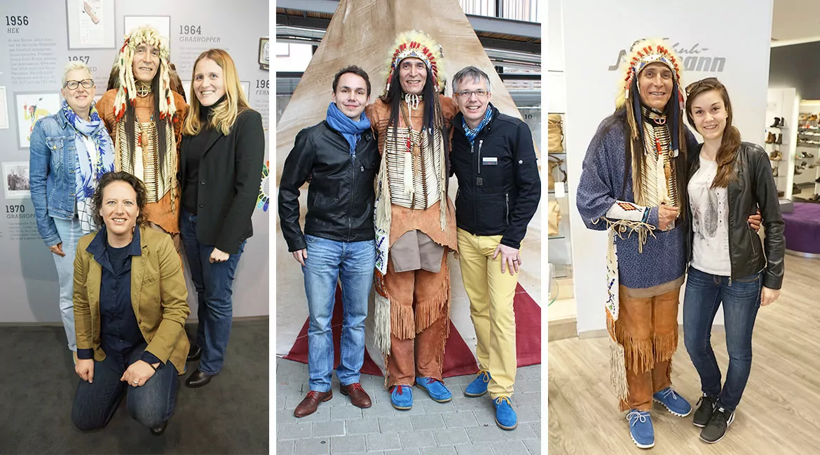 Seit dieser Zeit begleitet uns Robert auf allen Messen – von Berlin über Birmingham, Warschau, Brüssel bis Mailand. Dabei ist er stets Botschafter unserer Marke und die meistfotografierte Person bei allen Veranstaltungen. In seinem traditionellen Outfit und unverwechselbaren Kopfschmuck mit echten Adlerfedern ist er der unverkennbar echte Vertreter der Sioux. Auch unsere Handelspartner unterstützt Robert mit seiner Präsenz bei zahlreichen Events zwischen Hamburg und München, Freiburg und Berlin. Als Fan unserer Schuhe trägt er dazu selbstverständlich stets unsere Grashopper-Mokassins. Sein persönlicher Lieblingsschuh ist in dieser Saison statt des klassischen Grashoppers mit echter Kreppsohle ein Modell der aktuellen Kollektion mit sportlicher Leichtgummisohle mit Sägezahnprofil. Welcher Schuh sein aktueller Favorit ist, erfahren Sie hier.