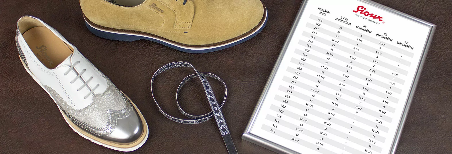 To ensure that you always get the optimum shoe size when shopping at Sioux, we have also adopted the English system of half sizes (intermediate sizes) for our collections. We produce individual models up to size 15 so that those with big feet can find the right shoes when shopping with us too.