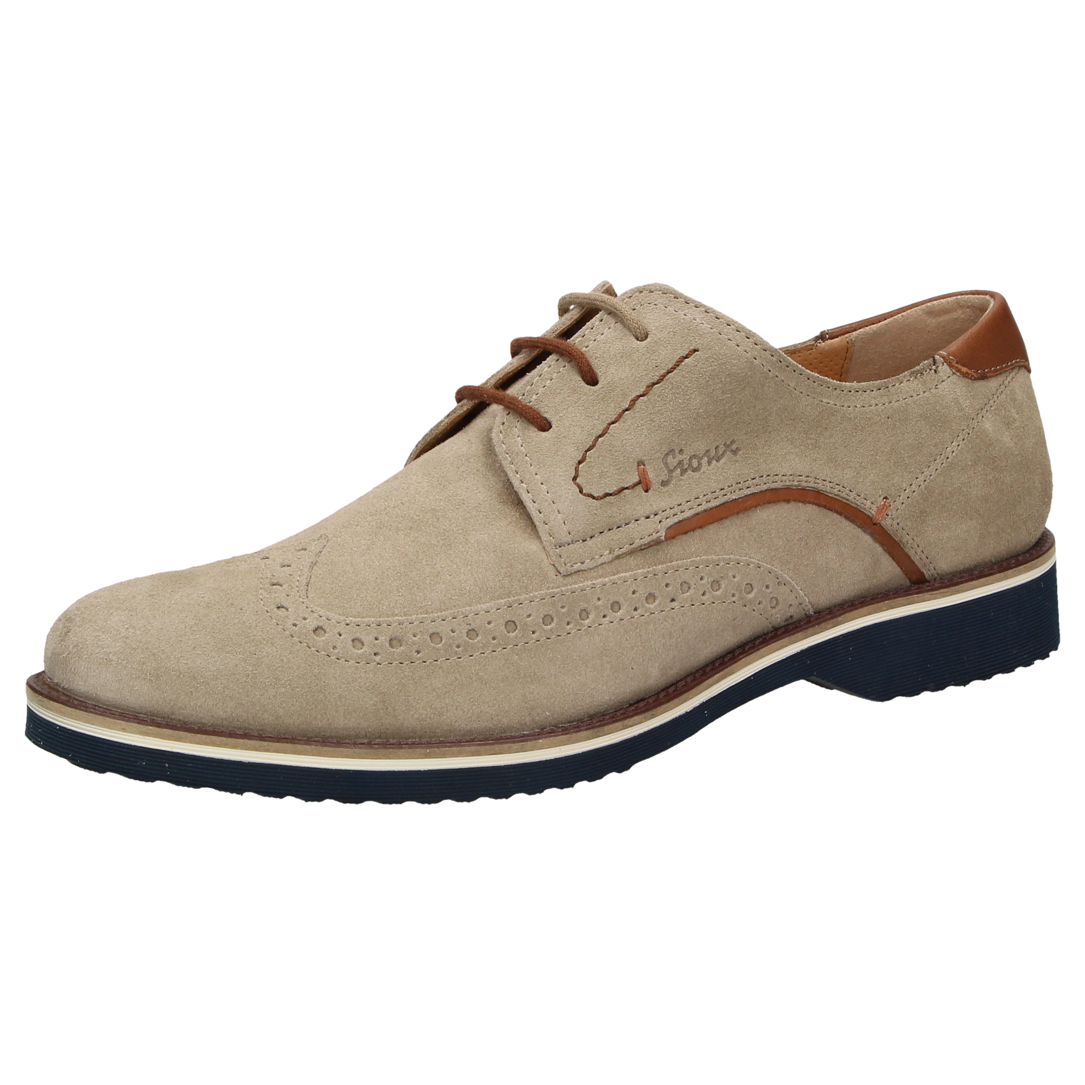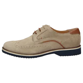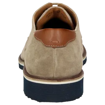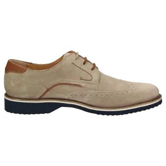 Popular men's lace-ups made of fine calfskin suede in a comfortable G-width fitting featuring stylish Budapest wing tip on the vamp. The fully padded, soft insole has a leather/microfibre inner lining. Blue lightweight rubber sole with a 10 mm heel and embossed edging in contrasting white. The rubber sole cushions each step and provides a comfortable tread - a shoe for those who are always on the go. This shoe comes with a second pair of shoelaces in a contrasting colour.