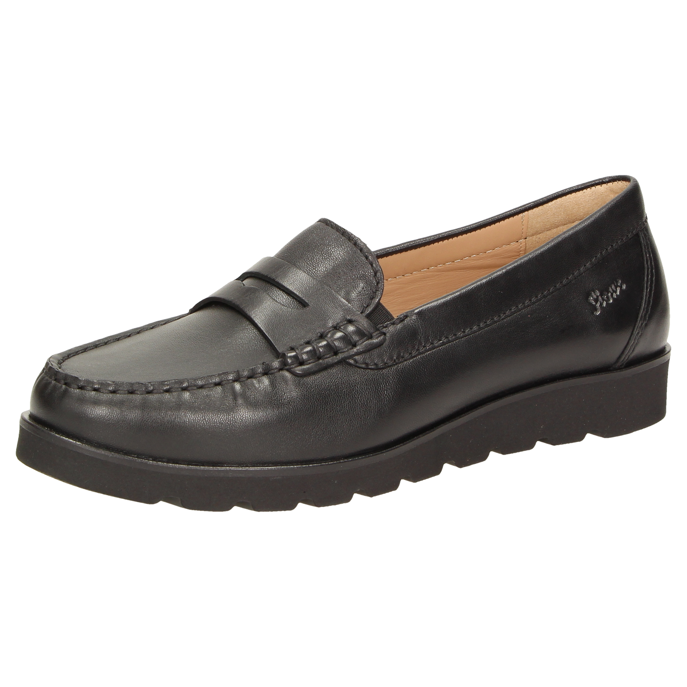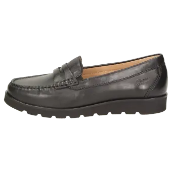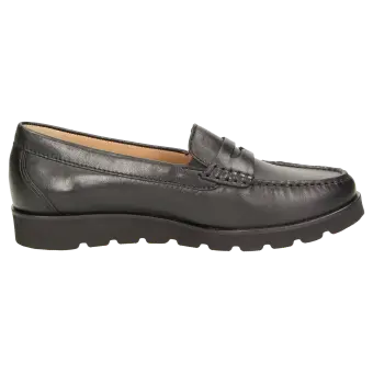 Lightweight women's moccasin-style slip-ons made from soft lambskin nappa with penny loafer trimming in a H width fitting. Lined with calfskin and featuring a full-length, soft, padded calfskin covered insole that can also be removed and replaced with your own inlay. Comfortable to slip on thanks to the rubber inserts at the tongue. Soft, lightweight rubber sole with 10 mm arch and leather edging.