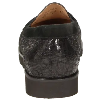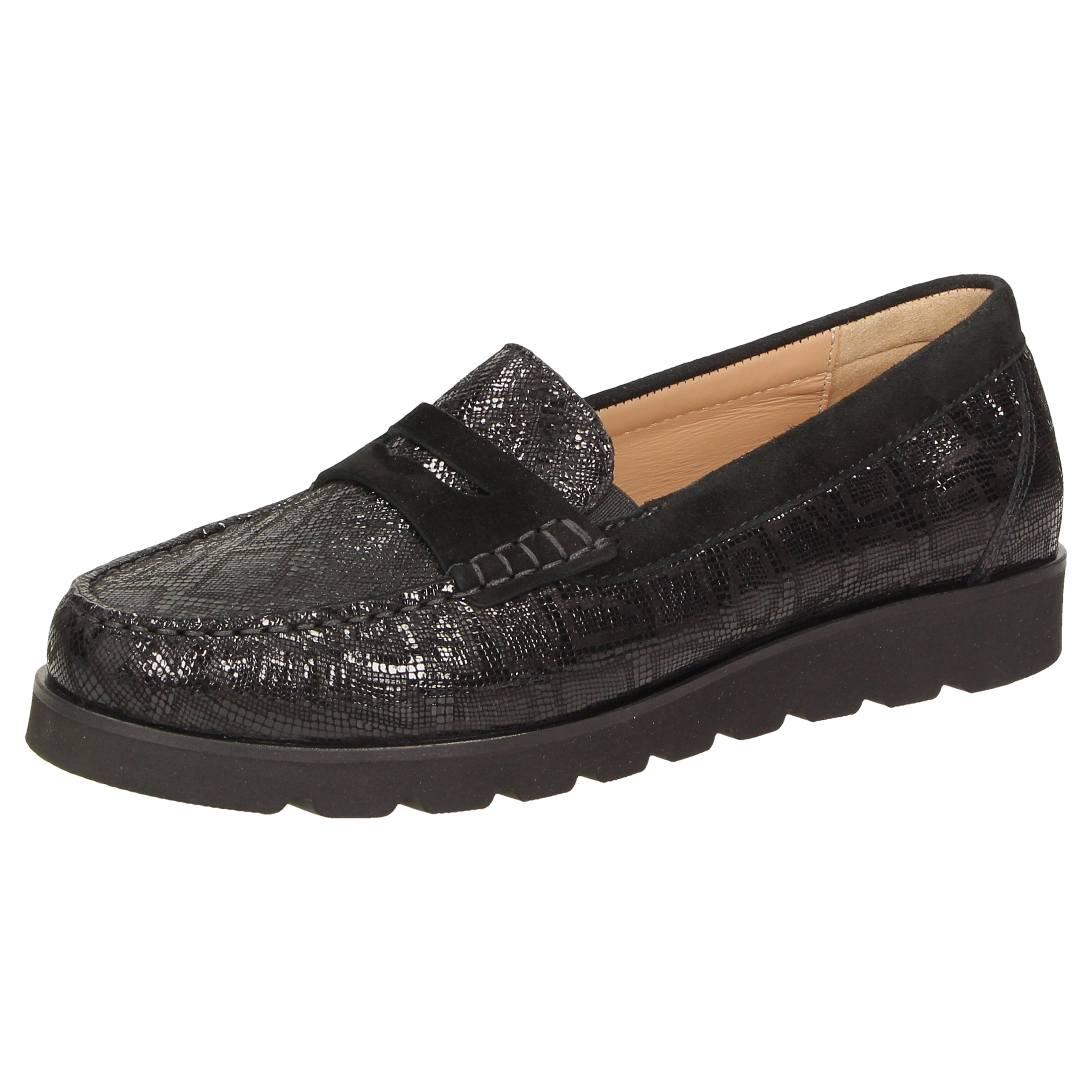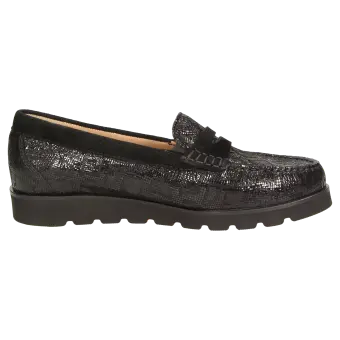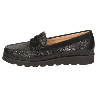 Lightweight women's moccasin-style slip-ons made of goatskin suede with lizard-skin print and featuring penny loafer trimming in an H-width fitting. Lined with calfskin and featuring a full-length, soft, padded calfskin covered insole that can also be removed and replaced with your own inlay. Comfortable to slip on thanks to the rubber inserts at the tongue. Soft, lightweight rubber sole with 10 mm arch and leather edging.