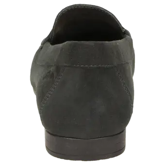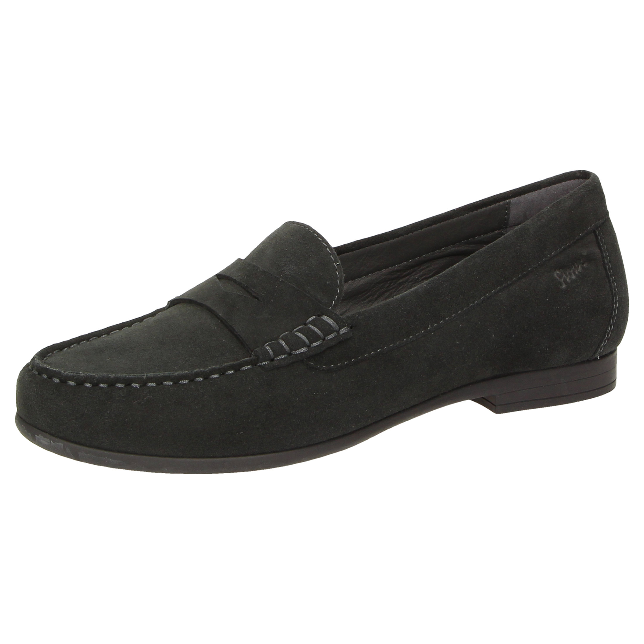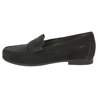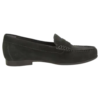 A women's classic moccasin-style slip-on in a comfortable G-width fitting made of soft goatskin suede with a fashionable penny loafer trimming. The model features leather lining, a non-slip rubber sole and a leather-covered removable insole, making this women's shoe perfect for using your own insoles.