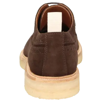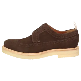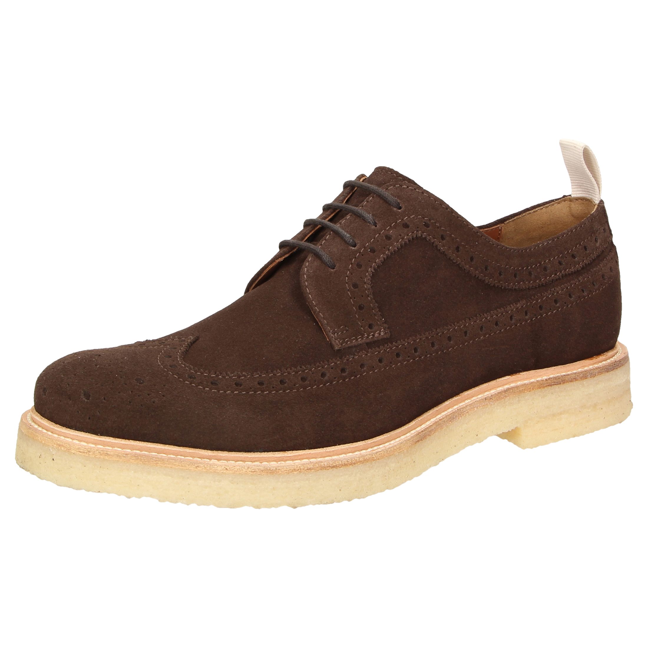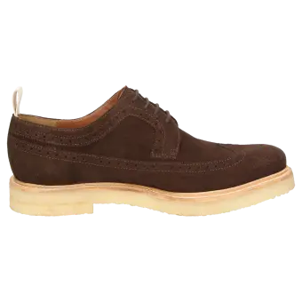 Full-brogue-herenschoen met vetersluiting, in gemakkelijke G-wijdte, uit de serie APOLLO van Sioux, van fijn kalfssuède met karakteristieke vleugelkap en lyra-perforatie. Markant met echte crêpezool van natuurlijke caoutchouc en opgelegde leerrand. Comfortabel model met zacht gevoerd leren voetbed en leren voering. Exclusief in kleine serie gemaakt model!