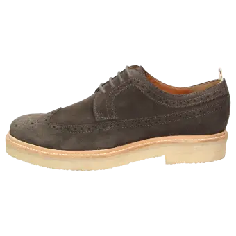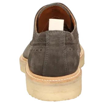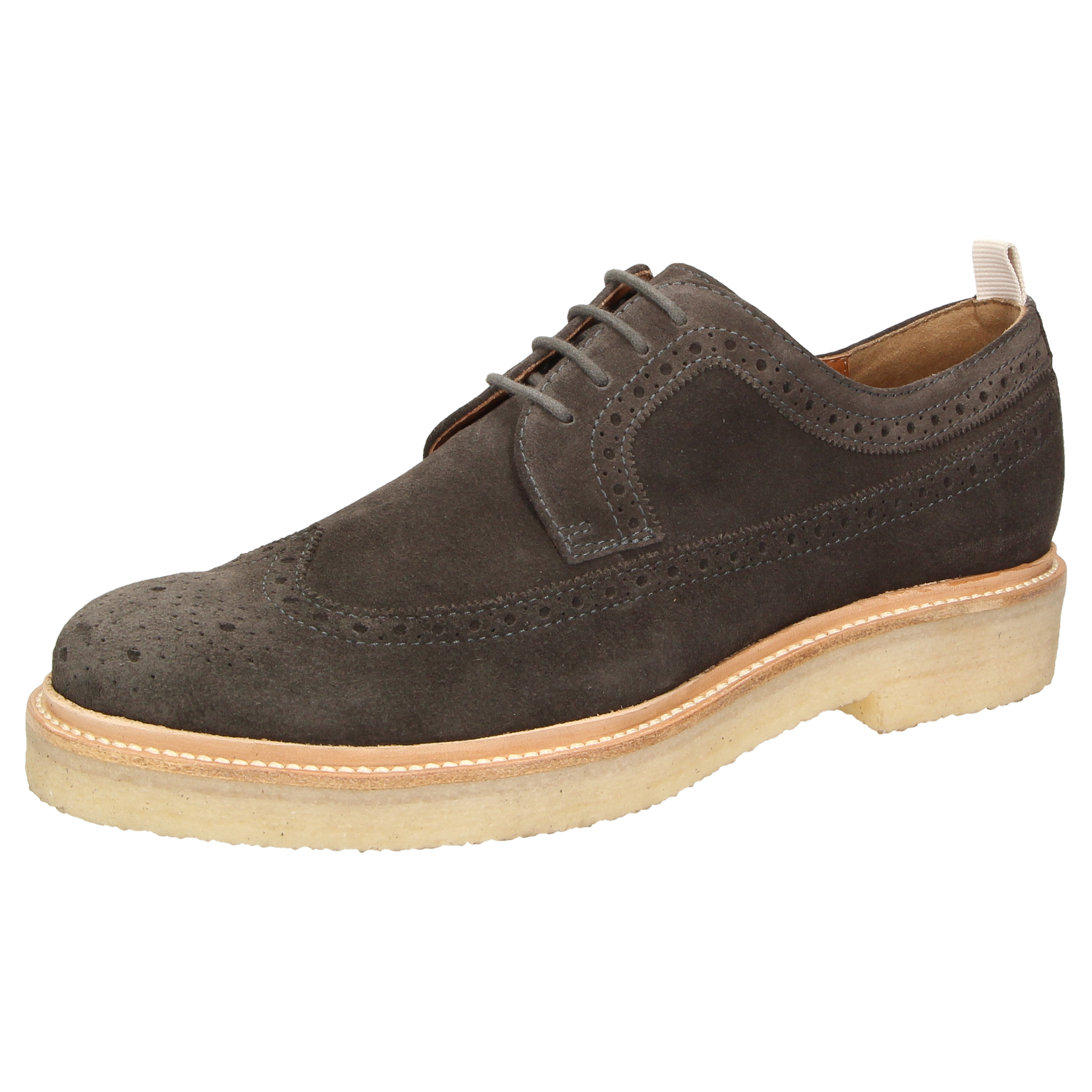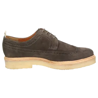 Full-brogue-herenschoen met vetersluiting, in gemakkelijke G-wijdte, uit de serie APOLLO van Sioux, van fijn kalfssuède met karakteristieke vleugelkap en lyra-perforatie. Markant met echte crêpezool van natuurlijke caoutchouc en opgelegde leerrand. Comfortabel model met zacht gevoerd leren voetbed en leren voering. Exclusief in kleine serie gemaakt model!