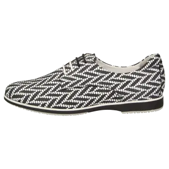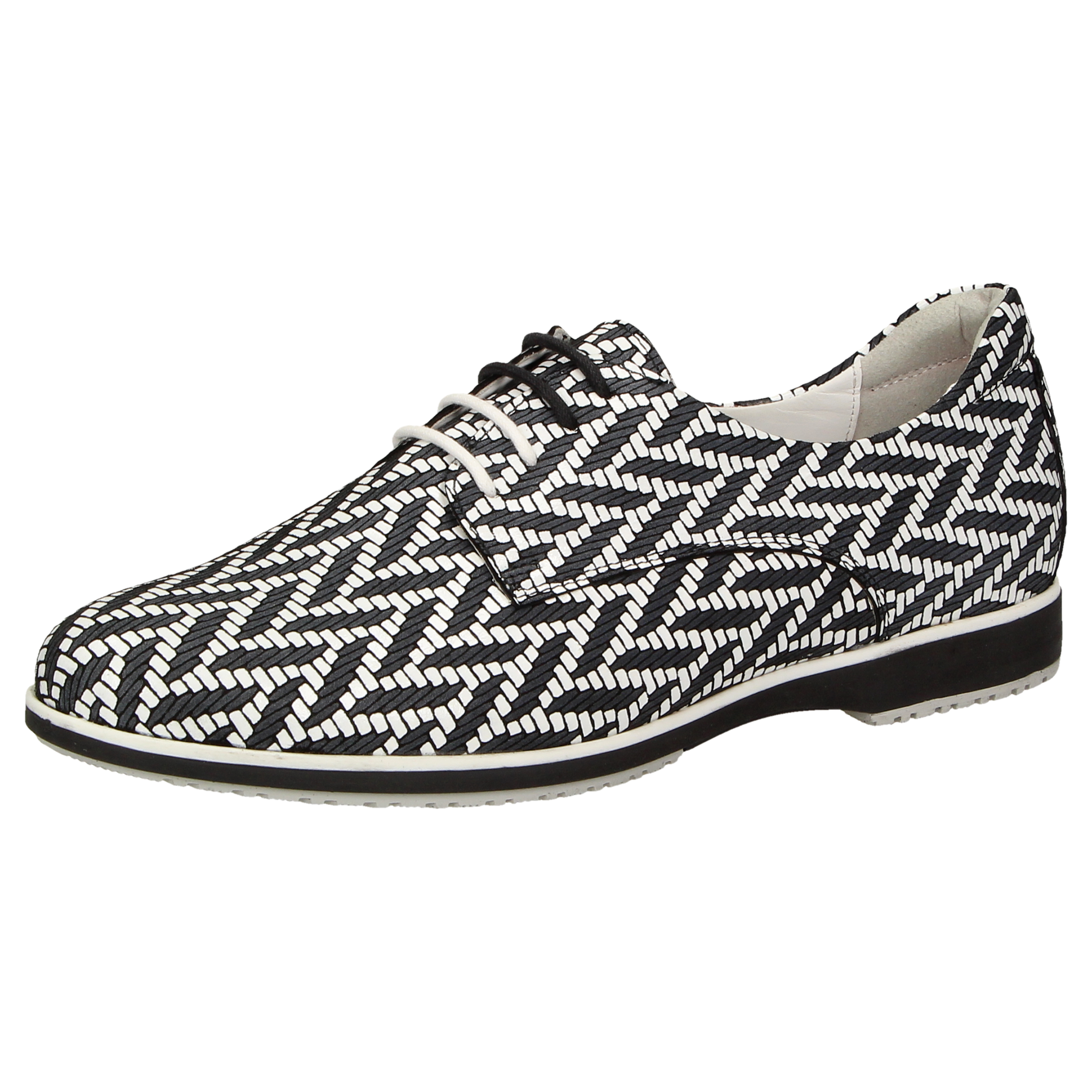Deze damesschoen is een absolute blikvanger. De comfortabele dames-sneaker van geitensuède en een boeiende print als optimale combinatie van mode en comfort. Gemakkelijke G-wijdte en een hoogwaardige binnenvoering van kalfsleer. De zacht gevoerde kalfsleren dekzool en de slipremmende rubberzool met 15mm-hak en witte contrastrand zorgen bij deze damesschoen voor een aangenaam loopgevoel. Als bijzonder extraatje krijgt u bij deze sneaker een tweede paar veters gratis.
