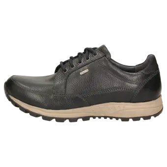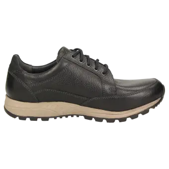 Sportieve casual-veterschoen van generfd rundleer, met waterdichte TEX-membraan en uitneembaar voetbed - en daarmee ook geschikt voor het dragen van de eigen inlegzool. De hooggetrokken hiel zorgt voor een optimale pasvorm en de 2-componenten-rubberzool zorgt voor comfort en demping bij het lopen.