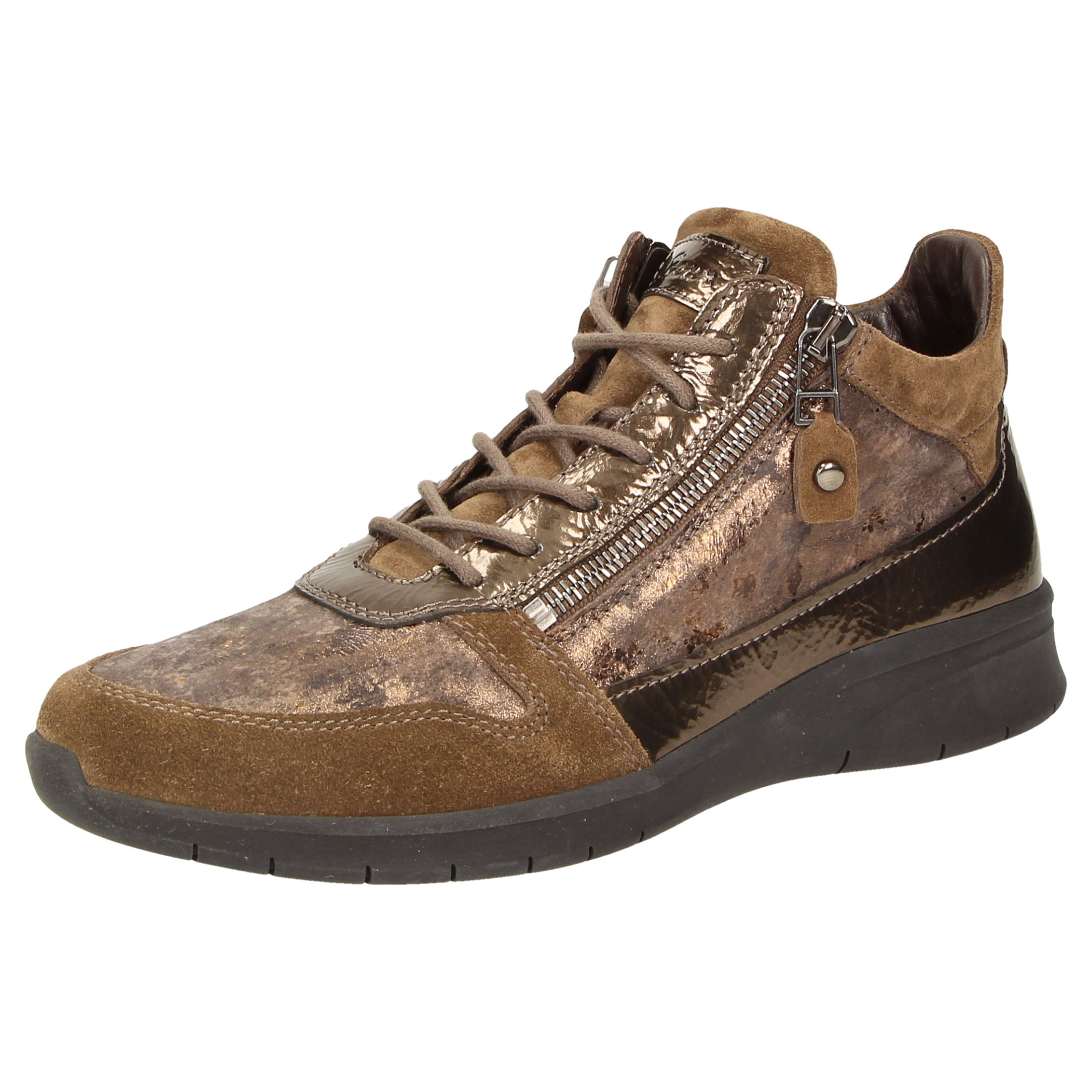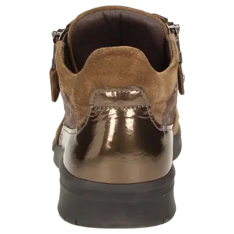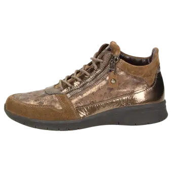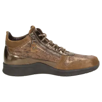 Zeer comfortabele, enkelhoge dames-veterschoen met 2 extra ritsen opzij voor gemakkelijk aantrekken. In California-maakwijze ambachtelijk vervaardigd uit een materiaalmix van fijn kalfssuède, deels met metallic-optiek en applicaties van gekreukt metallic-leer. Doorgaande voering van microvezel. Doorlopende, zacht gevoerde en kalfsleren dekzool die eenvoudig vervangen kan worden door een eigen inlegzool. Uiterst comfortabele H-wijdte en een bijzonder flexibele loopzool van natuurlijke caoutchouc.