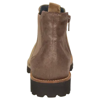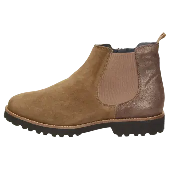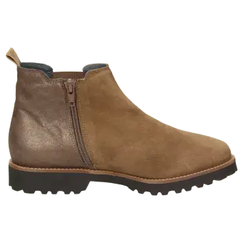 Dames Chelsea-bootie van Sioux, in H-wijdte, met elastiek opzij, rits en lus aan de hiel. Vervaardigd van fijne lamssuède-mix. Gevoerd met kalfsleer en een elastische textielvoering onder de voorvoet. Geschikt voor hallux-valgus-voeten! Uitneembaar, met kalfsleer beklede dekzool met zachte demping, geschikt voor eigen inlegzolen. Geprofileerde, herfstachtig ogende lichte rubberzool met markante leerrand.