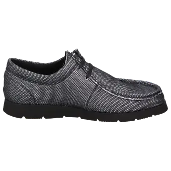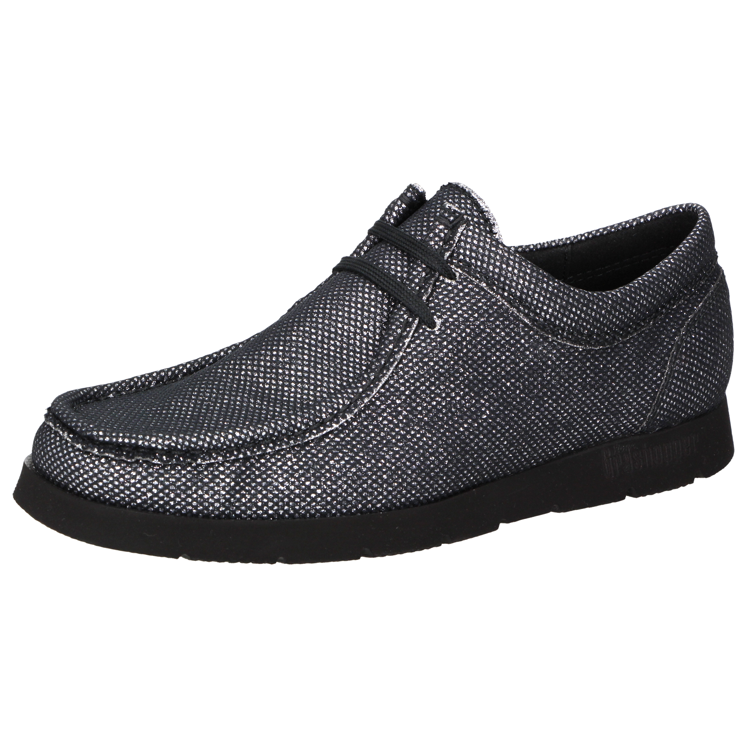Nieuwe Sioux-Grashopper in mocassin-maakwijze, van textiel met glittereffect. Met markante lichte rubberzool voor een zachte tred. Gevoerd met textiel en zachte, uitneembare kalfsleren dekzool.