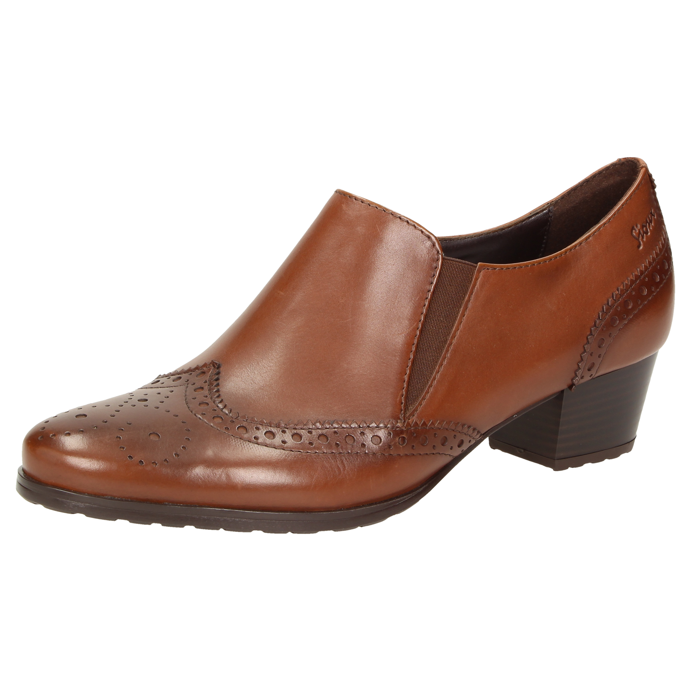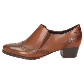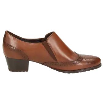 Klassieke hoogfront-pump van zacht kalfsleer, met modische vleugelkap en blokhak. Het elastiek opzij zorgt voor een perfecte pasvorm en gemak bij het aantrekken. Met zijn iets geprofileerde rubberzool is dit model geschikt voor het hele jaar.
