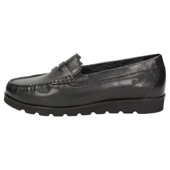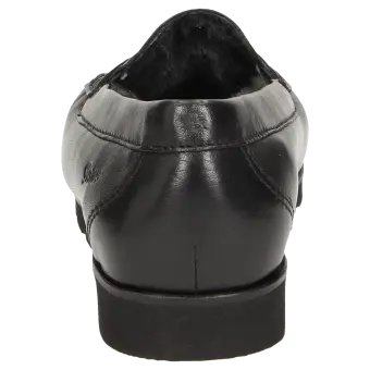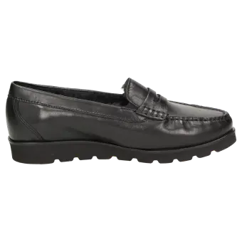 Lichte dames-instapper in mocassin-maakwijze, van zacht lamsnappa met pennyloafer-element, in H-wijdte. Gevoerd met warme lamsvacht en doorlopende, zacht gevoerde en met vilt beklede dekzool die eruit genomen en vervangen kan worden door een eigen inlegzool. Gemak bij het aantrekken dankzij elastiek opzij. Zachte, lichte rubberzool met 10mm-hielverhoging en opgelegde leerrand.