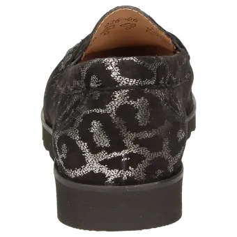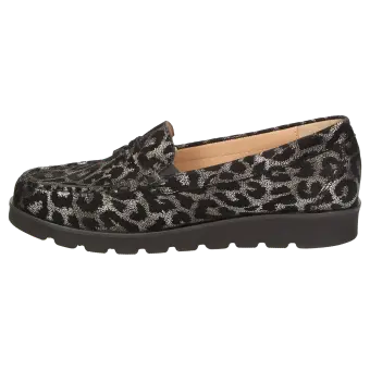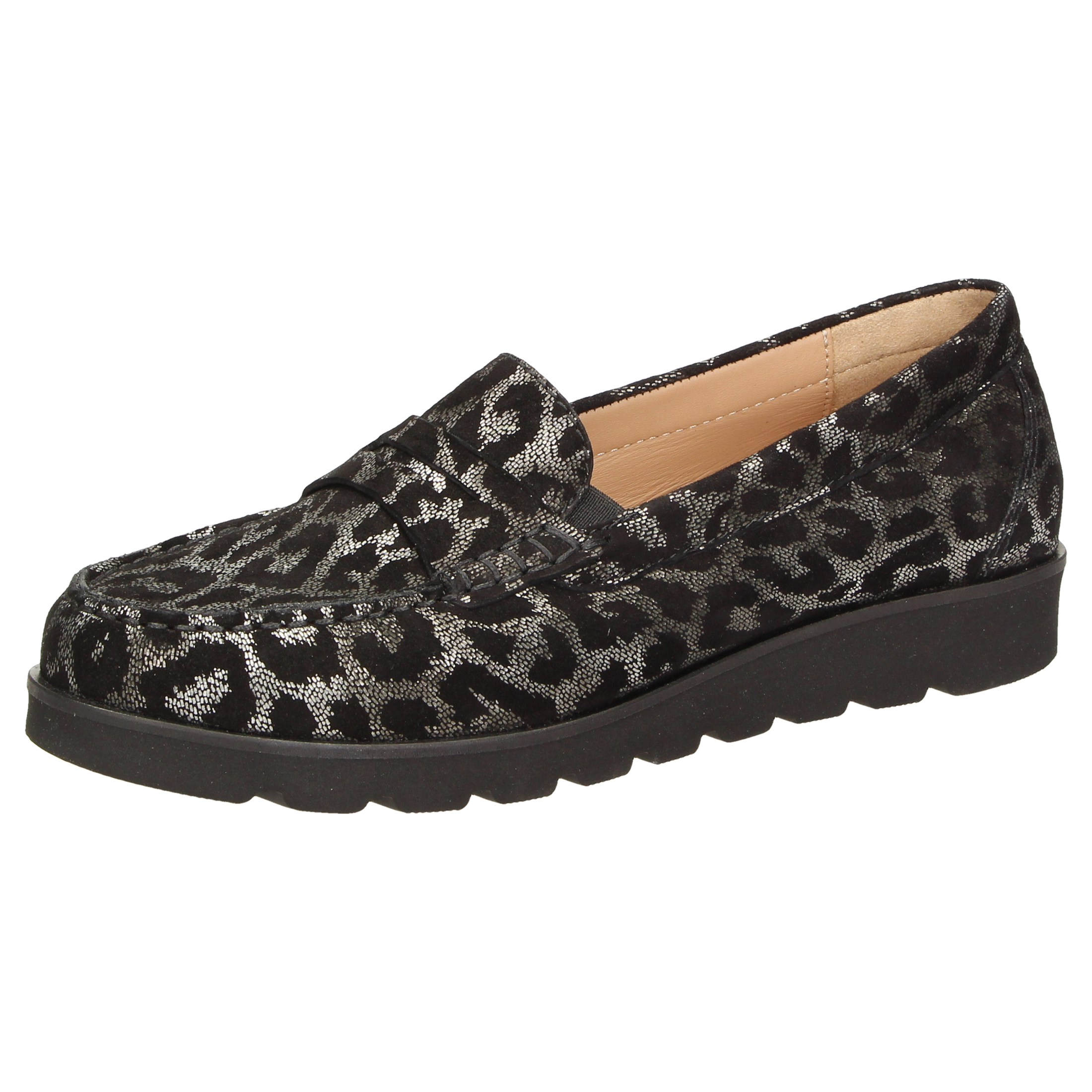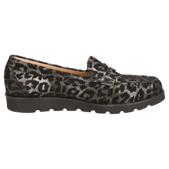 Lichte dames-instapper in mocassin-maakwijze, van geitensuède met leo-print en pennyloafer-element, in H-wijdte. Gevoerd met kalfsleer en doorlopende, zacht gevoerde en met kalfsleer beklede dekzool die eruit genomen en vervangen kan worden door een eigen inlegzool. Gemak bij het aantrekken dankzij elastiek opzij. Zachte, lichte rubberzool met 10mm-hielverhoging en opgelegde leerrand.