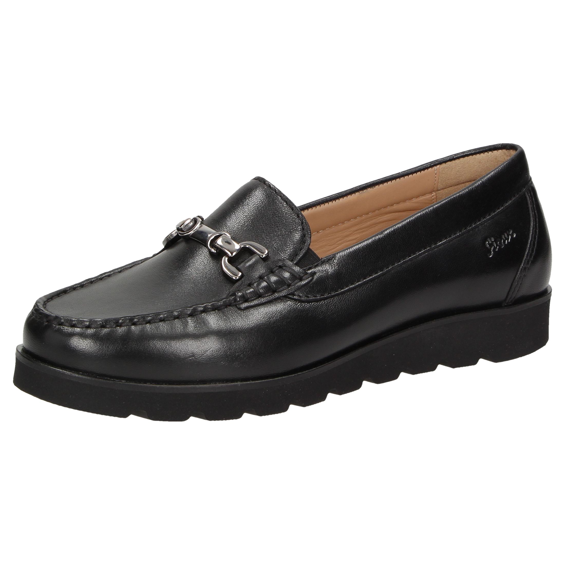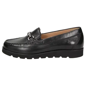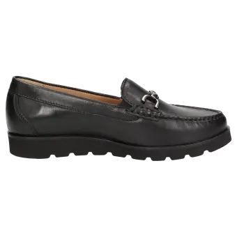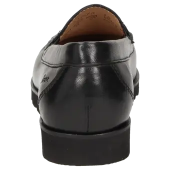 Lichte dames-instapper in mocassin-maakwijze, van zacht lamsnappa met mooie metalen trens, in H-wijdte. Gevoerd met kalfsleer en doorlopende, zacht gevoerde en met kalfsleer beklede dekzool die eruit genomen en vervangen kan worden door een eigen inlegzool. Gemak bij het aantrekken dankzij elastiek opzij. Zachte, lichte rubberzool met 10mm-hielverhoging en opgelegde leerrand.