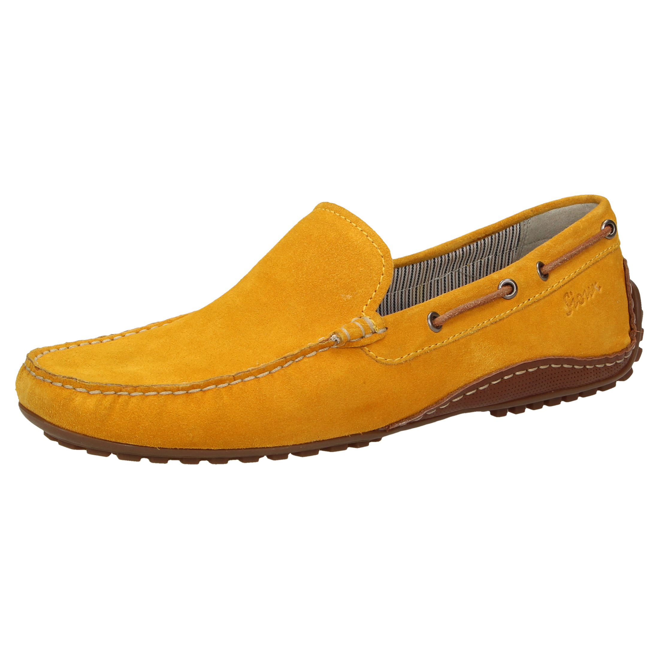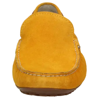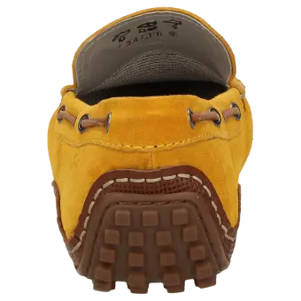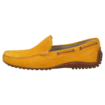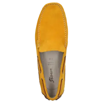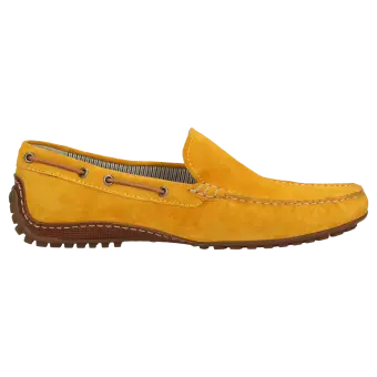 Sportieve, tijdloze zomermocassin voor heren, van fijn kalfssuède. Het met de hand vervaardigde model in de normale G-wijdte heeft een leren binnenvoering. Het model voor autobestuurders heeft een lichte, aan de hiel hooggetrokken rubberzool en een met kalfsleer bekleed wisselvoetbed voor een aangenaam loopcomfort.
