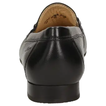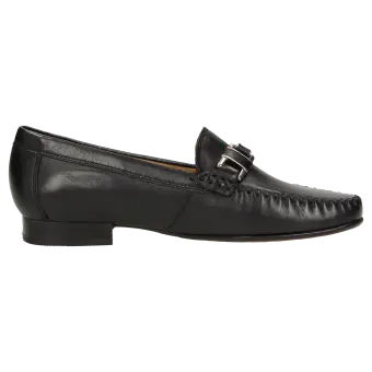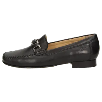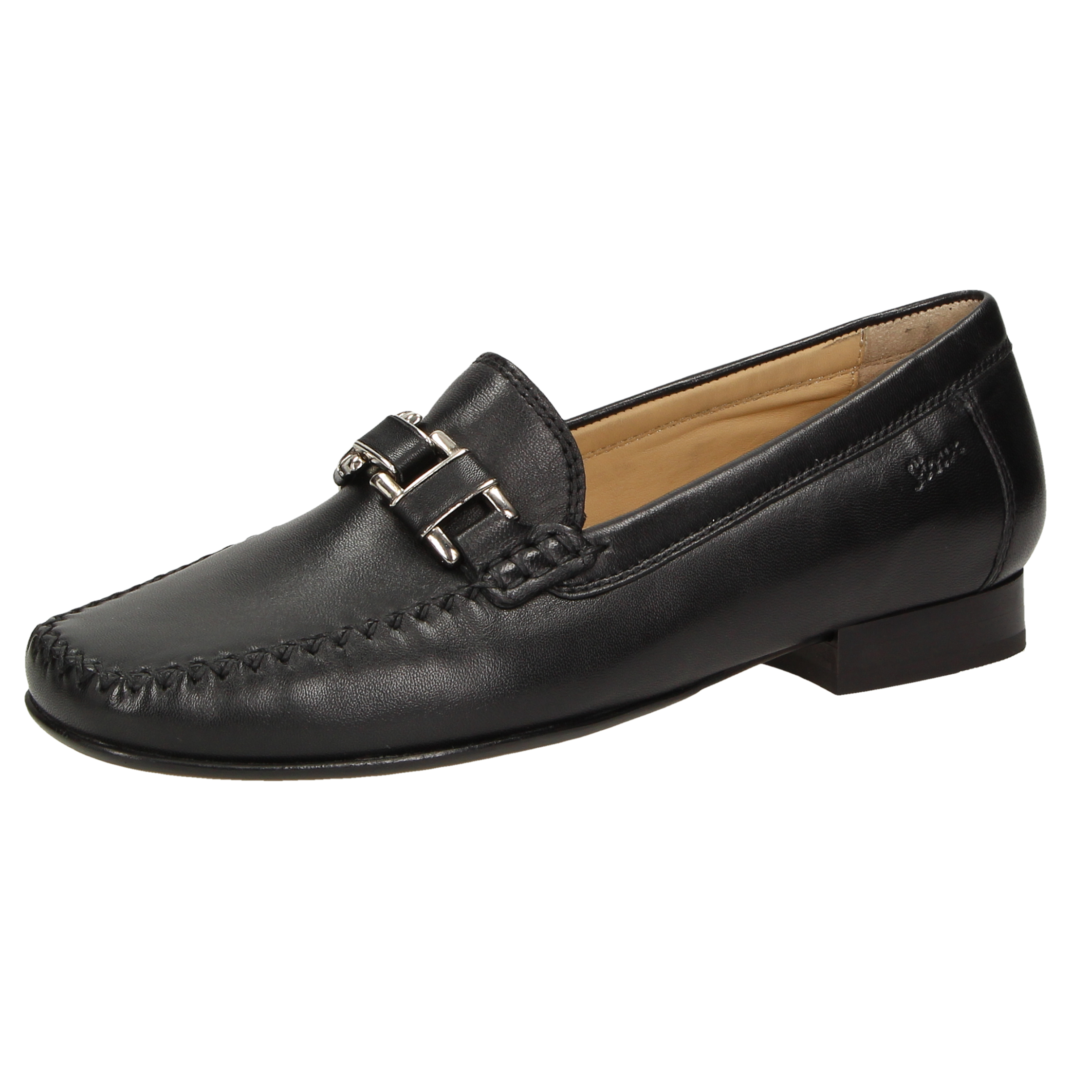 Platte dames-mocassin van fijn geitensuède, in schoenwijdte F. Uitstekende pasvorm en tijdloze elegantie, met als blikvanger een element in metaal en leer. Voering en zachte doorlopende dekzool van kalfsleer. Zachte en fijne rubberzool met platte hak. Een typische dames-mocassin van Sioux, met smalle neus.