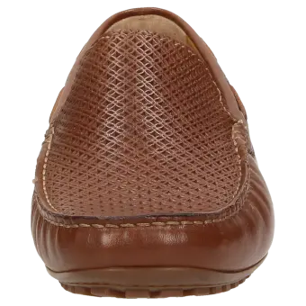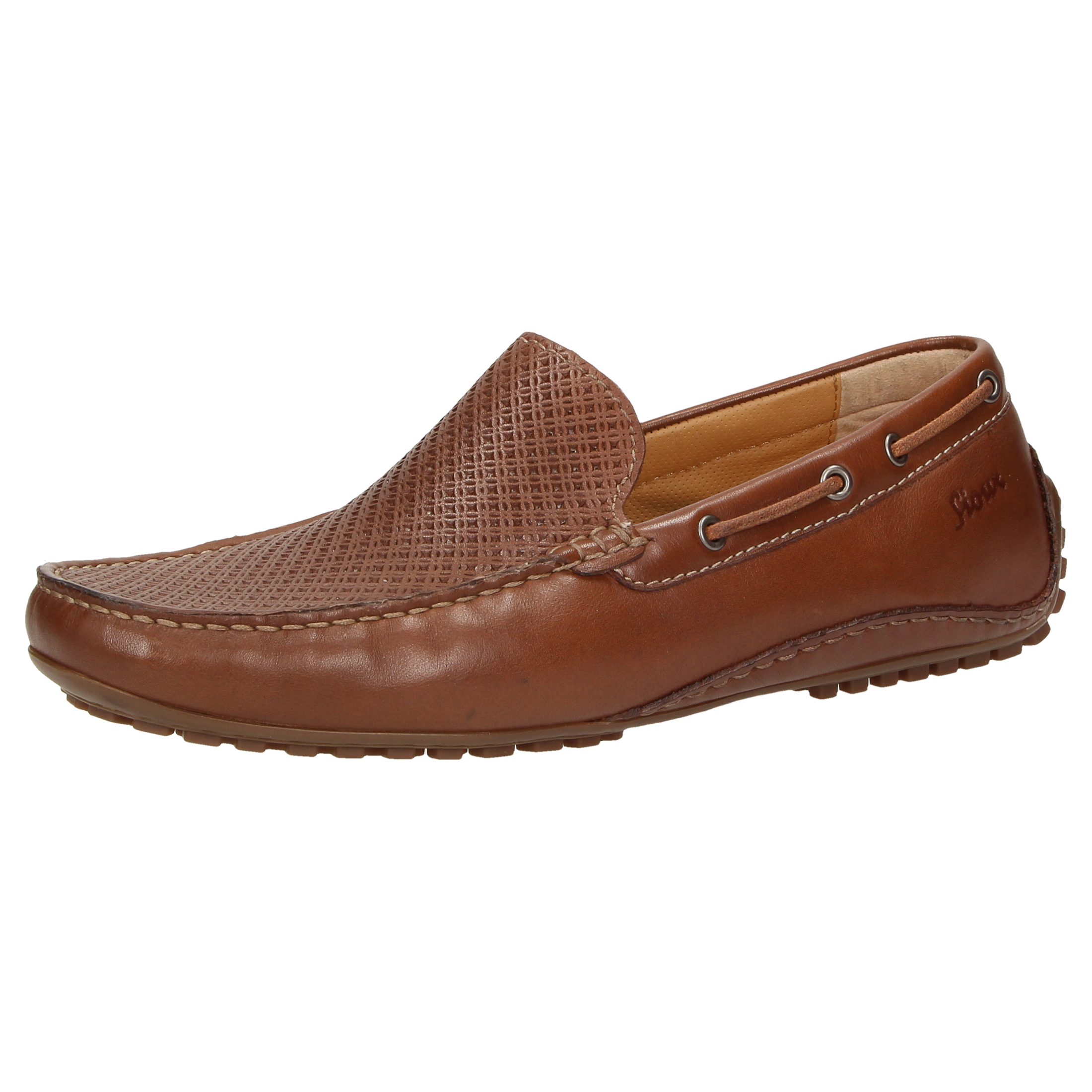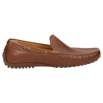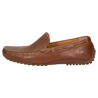 Sportieve heren-mocassin van fluweelzacht kalfsleer, met fijne zomerse preging in het voorblad. Het met de hand vervaardigde model in de normale G-wijdte heeft een leren binnenvoering. Het model voor autobestuurders heeft een lichte, aan de hiel hooggetrokken rubberzool en een met kalfsleer bekleed wisselvoetbed voor een aangenaam loopcomfort.
