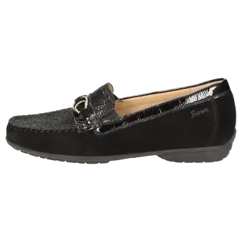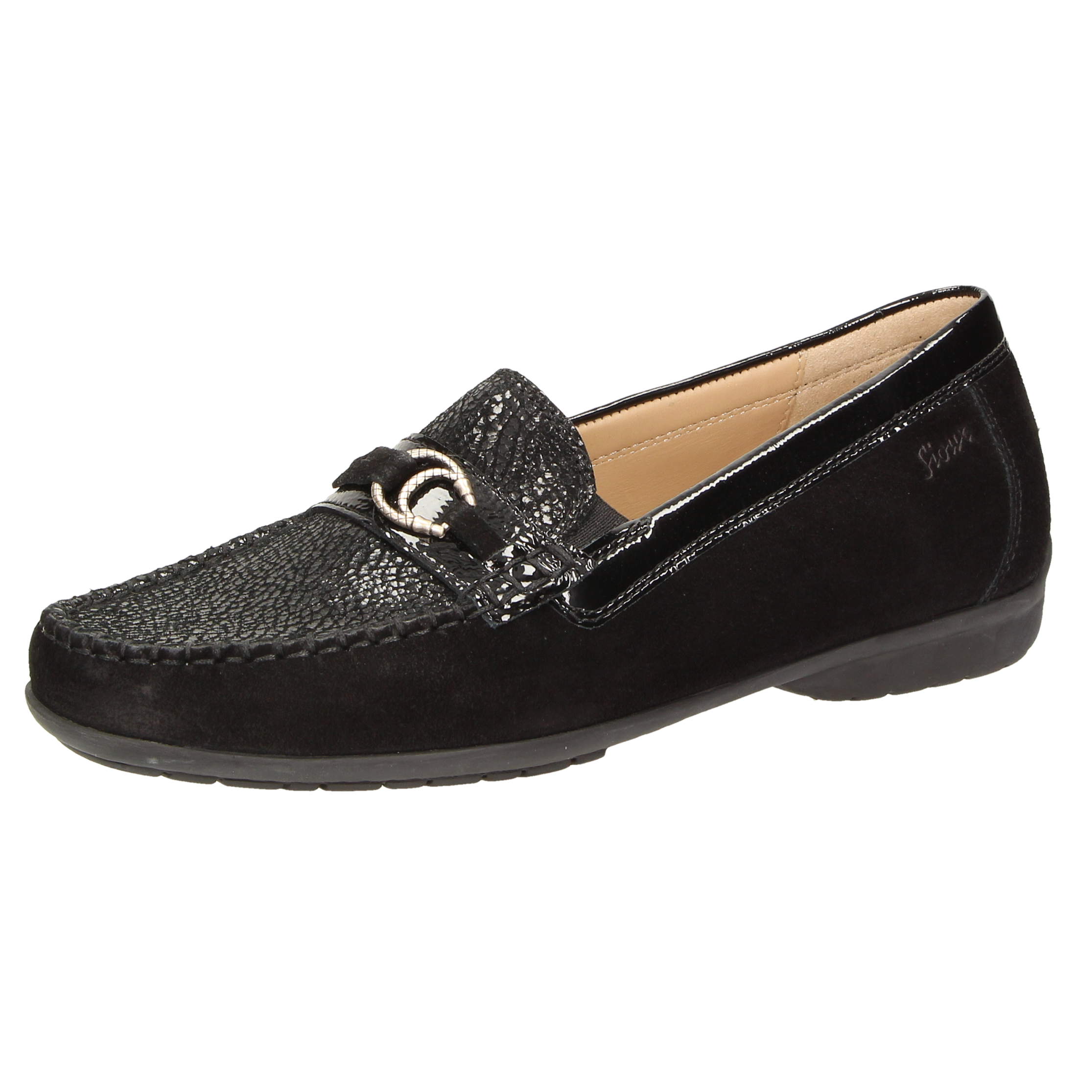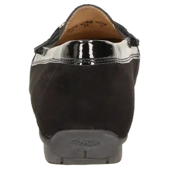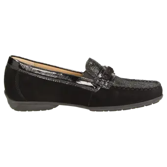 Sportieve dames-instapper in ambachtelijke mocassin-maakwijze, van een modische kalfssuède-combinatie met flexibele rubberzool en optimaal draagcomfort. Gevoerd met kalfsleer en doorlopende, zacht gevoerde en met kalfsleer beklede dekzool die eruit genomen en vervangen kan worden door een eigen inlegzool. Gemak bij het aantrekken dankzij elastiek opzij. Met zijn comforteigenschappen is deze dames-instapper een echte bestseller.