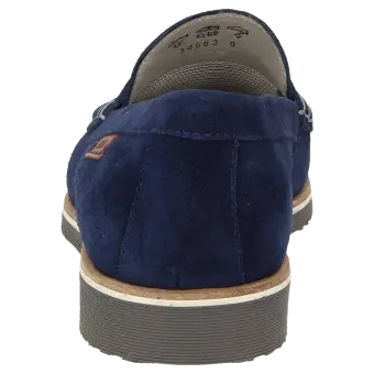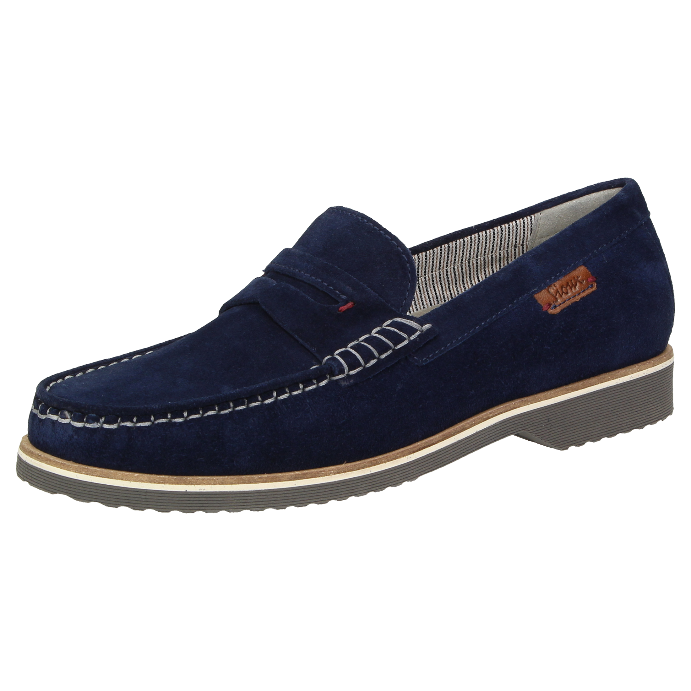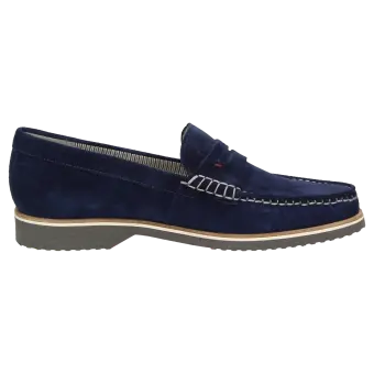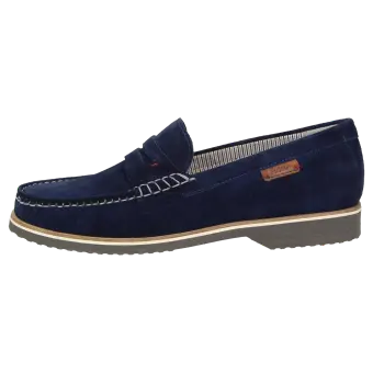 Trendy heren-mocassin van fijn kalfssuède, normale G-wijdte, met modisch pennyloafer-element. Lichte textielvoering en zacht, met leer bekleed wisselvoetbed. Blauwe, lichte rubberzool met 10mm-hak en opgelegde rand met wit contrast. De dempende rubberzool zorgt voor een aangenaam loopgevoel.