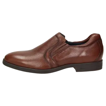 Heren-instapper in een optisch slanke, modische leestvorm en toch met een gemakkelijke meerwijdte. Twee elastiekinzetten opzij voor gemak bij het aantrekken. Binnenvoering in een combinatie van leer en microvezel, zacht gevoerd en met leer bekleed wisselvoetbed, eenvoudig te vervangen door de eigen inlegzool. Zeer zachte en verende rubberzool voor een perfect loopgevoel.