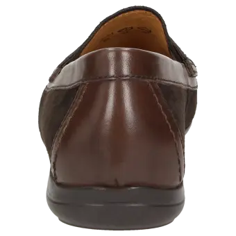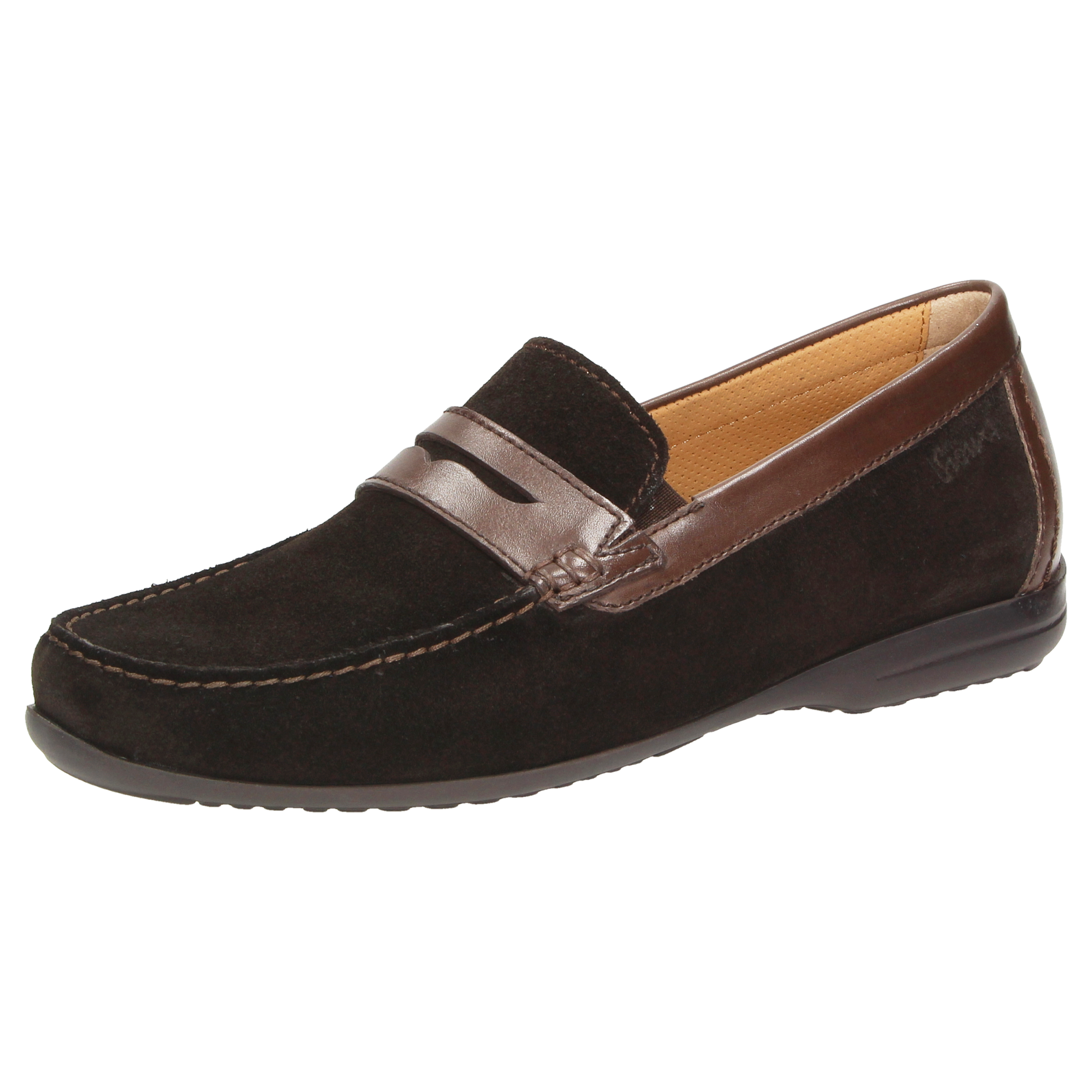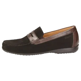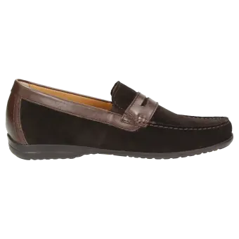 Heren-mocassin van zacht kalfssuède in een gemakkelijke extra-wijdte, met modisch pennyloafer-element in glad leer. Zacht gevoerd, met leer bekleed wisselvoetbed en hoogwaardige leren voering. Met zijn lichte rubberzool is deze schoen een perfecte begeleider voor de hele dag.
