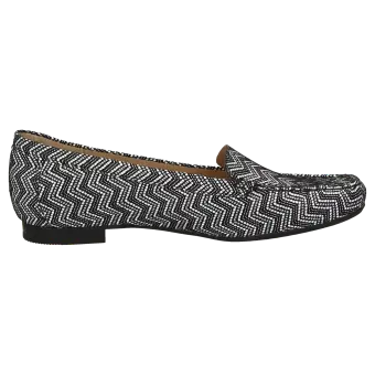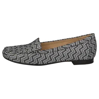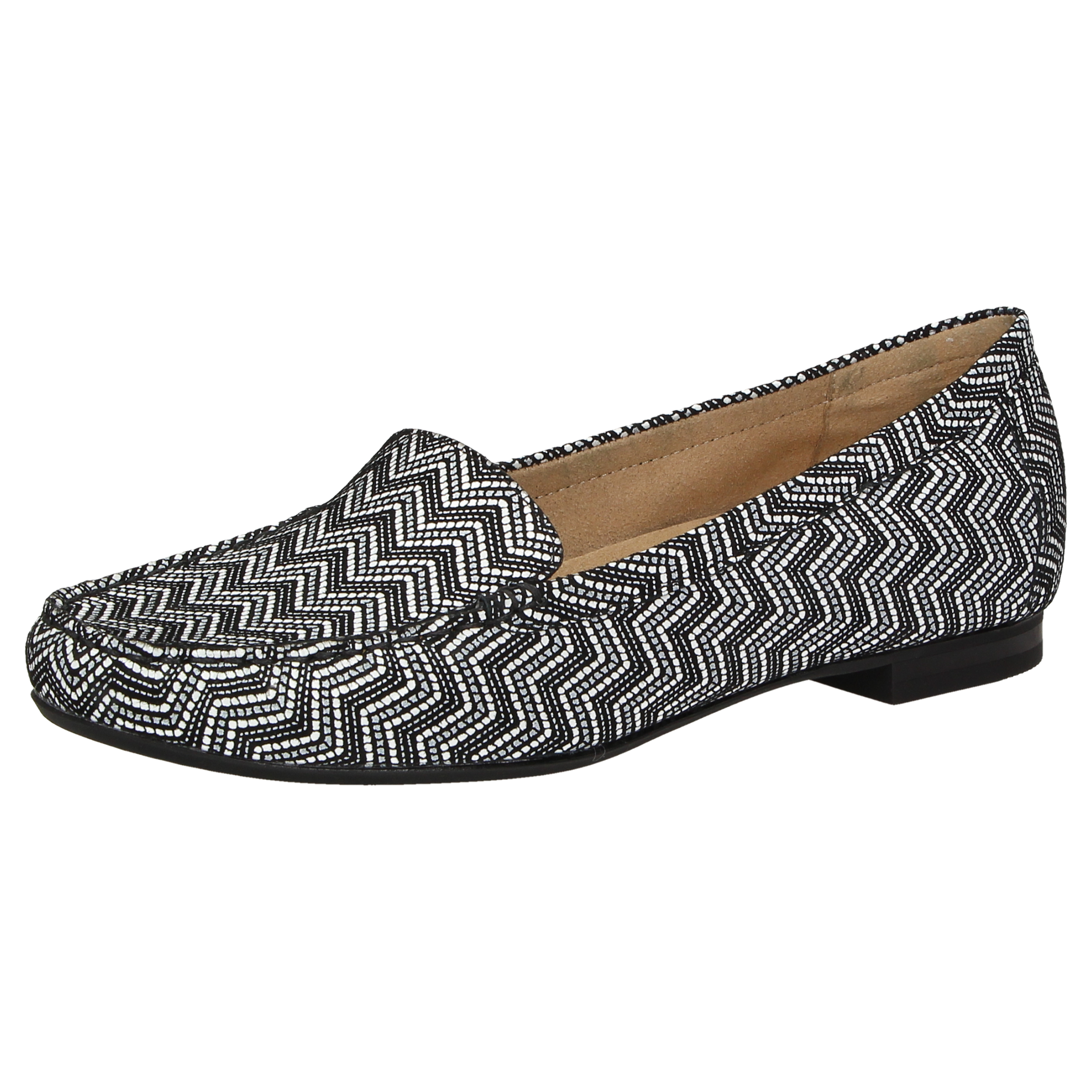 De vlotte dames-instapper in mocassin-maakwijze en schoenwijdte F: het zachte kalfsnubuck met modische effectprint en de luchtige binnenvoering van microvezel verwennen de voet. Extra comfort biedt de damesschoen met het gevoerde wisselvoetbed en de zomers lichte rubberzool.
