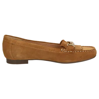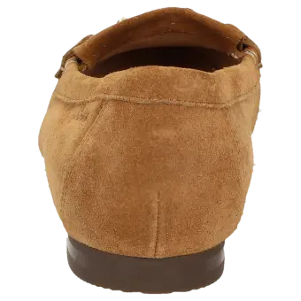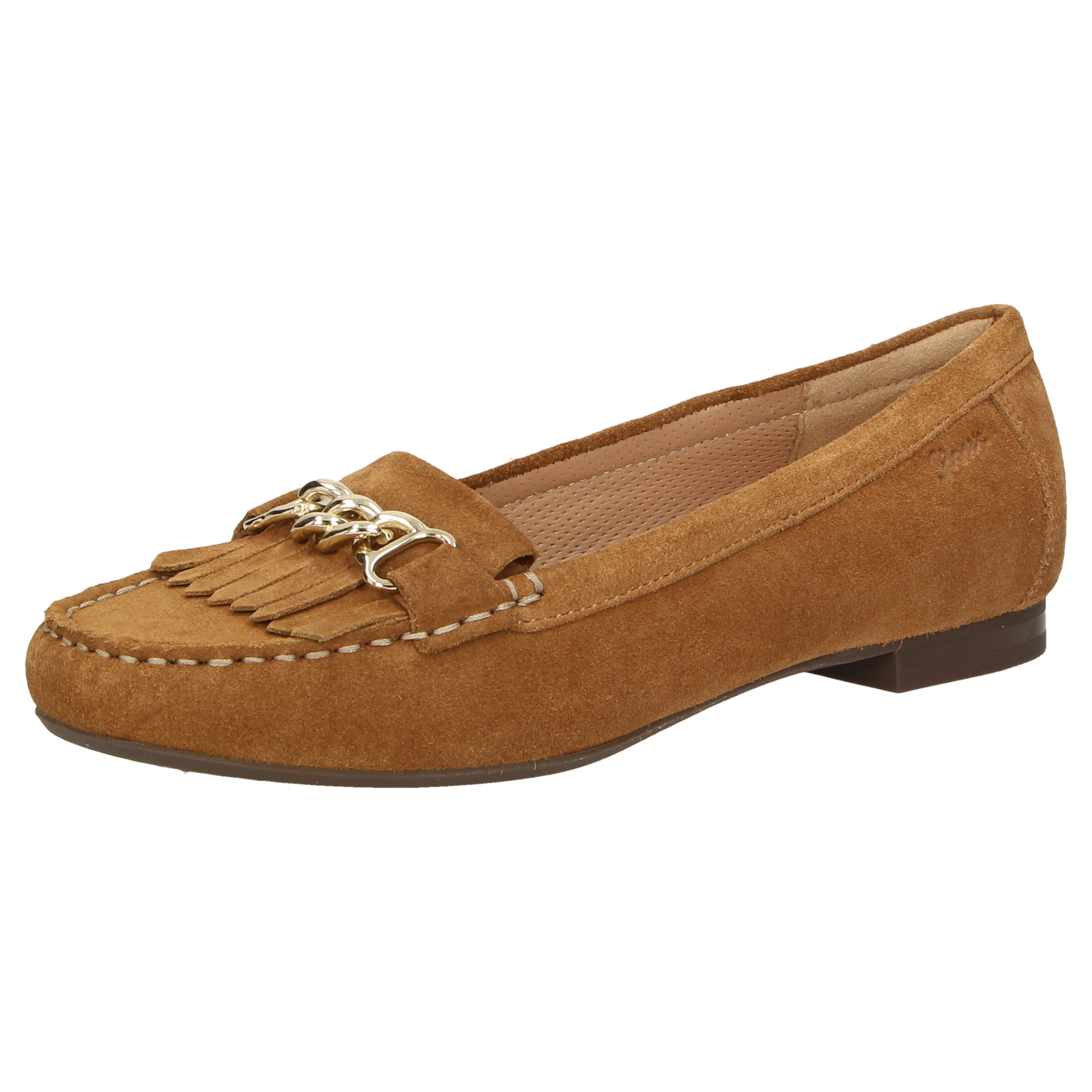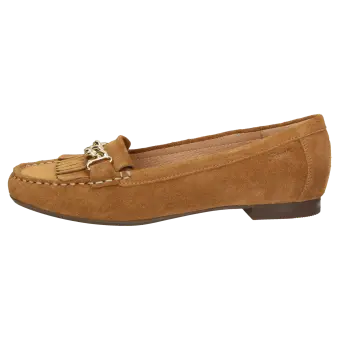 Platte dames-instapper in mocassin-maakwijze en schoenwijdte F, van kalfssuède, met modisch element in kettingoptiek en gevoerde franjetong. Doorlopend gevoerd met kalfsleer, met zacht gevoerde kalfsleren dekzool die uitgenomen en vervangen kan worden door een eigen inlegzool. Met de lichte rubberzool en de kleine hak is dit de perfecte schoen voor de zomer.