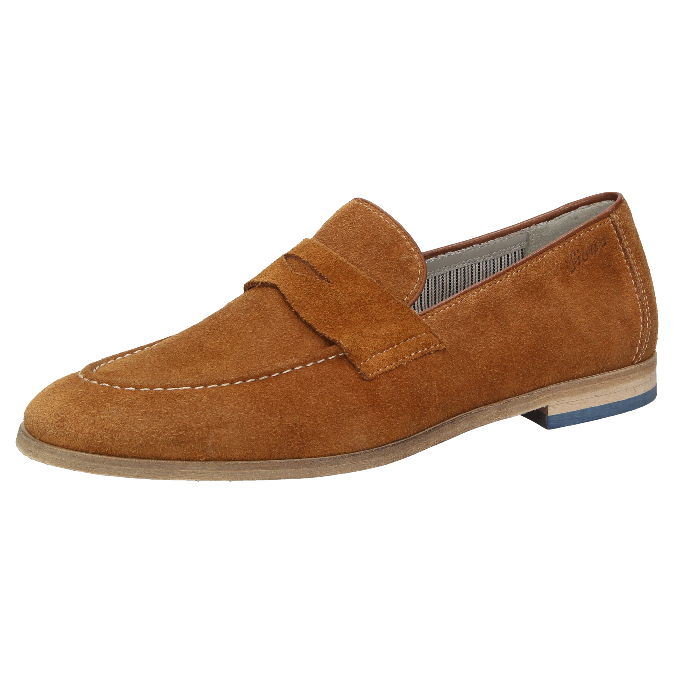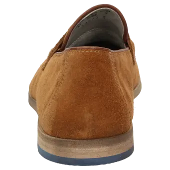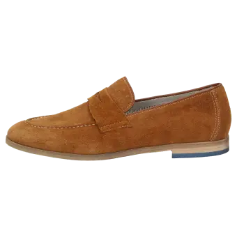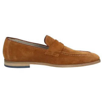 Legerer Herren-Slipper in modisch-schlanker Leistenform in G-Weite aus feinem Kalbvelours mit klassischer Penny-Loafer-Garnitur. Das lose eingelegte kalbslederbezogene Wechselfußbett und eine sommerliche Ledersohle runden dieses Modell ab.