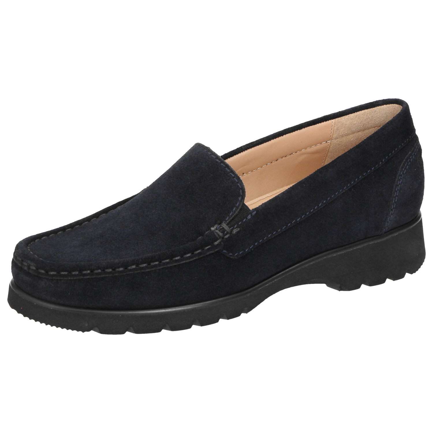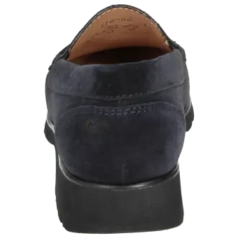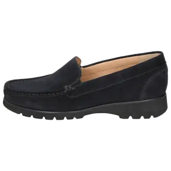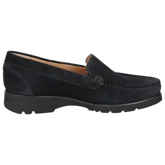 Leichter Damenslipper in Mokassin-Machart aus weichem Kalbvelours in H-Weite. Gefüttert mit Kalbleder und durchgehender, weich gepolsterter, kalblederbezogenen Decksohle zum Herausnehmen und Austauschen durch eine eigene Einlage. Weiche, profilierte Leichtgummisohle mit 25-mm-Sprengung.